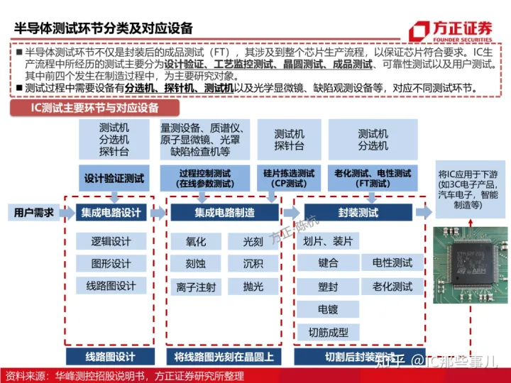 这里我们主要想跟大家分享一下生产全测的测试,这种是需要100%全测的,这种测试就是把缺陷挑出来,分离坏品和好品的过程。这种测试在芯片的价值链中按照不同阶段又分成晶圆测试和最终测试(FT,也叫封装测试或者成品测试),就是上面图(1)中的红色部分。