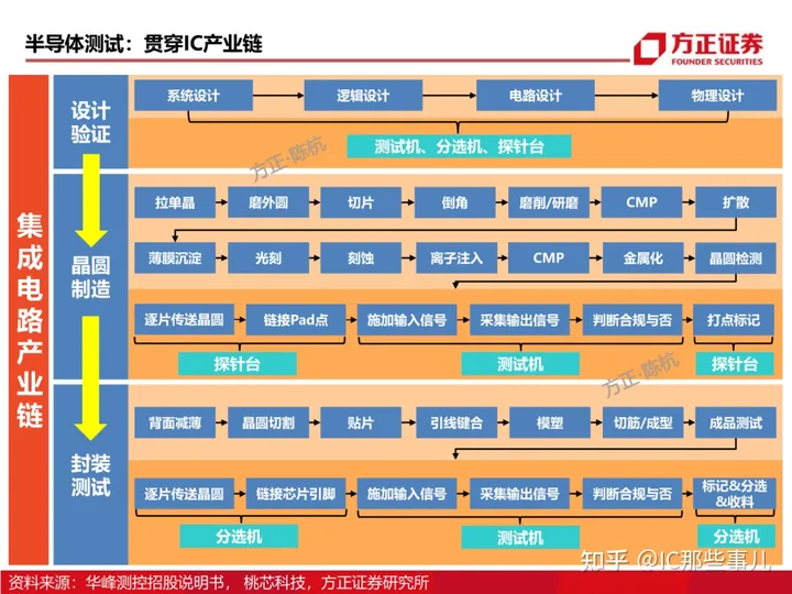 半导体测试作为半导体设计、生产、封装、测试流程中的重要步骤,是使用特定器具,通过对待检器件(DUT,Device Under Test)的检测,区别缺陷、验证器件是否符合设计目标,分离好品与坏品的过程。