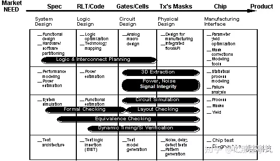 从市场需求出发,到产品tape out进行制造,包含了系统设计、逻辑设计、电路设计、物理设计,到最后开始投入制造。
