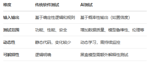 AI测试(AI Testing)是指针对人工智能(AI)系统、模型或应用进行的系统性验证和评估过程,目的是确保其功能、性能、可靠性、安全性以及伦理合规性符合预期目标。由于AI系统具有动态学习、数据驱动和不确定性等特点,AI测试与传统软件测试存在显著差异,需要采用专门的方法和工具。