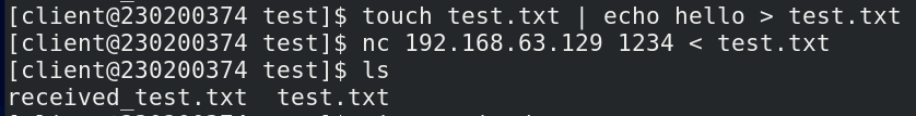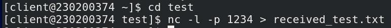 首先,接收方要启动监听模式,等待对方发送,监听了一个端口号为1234的端口,接受的文件名为receive_test.txt,注意这里只能输入文件名,不能是目录,否则的话会报错。