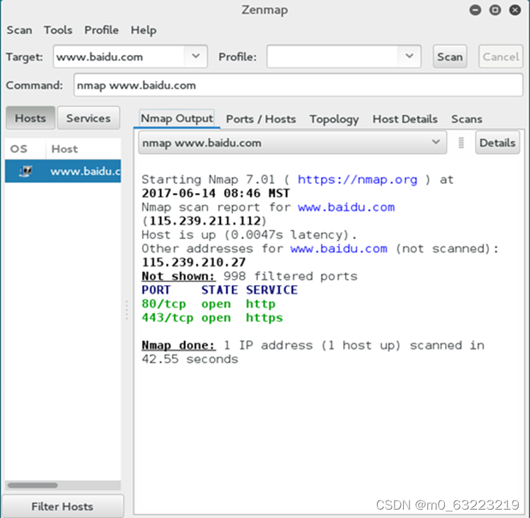 nmap -sF -T4 192.168.1.1 利用fin包对端口进行扫描,识别是否被关闭,收到RST包,说明被关闭。否则是open 后者 fileter状态。 (利用三次握手,可以绕开防火墙)