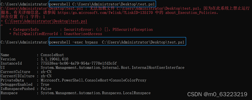 ExecvtionPolicy Bypass(-exec bypass):绕过执行安全策略,这个参数非常重要,在默认情况下,PowerShell的安全策略规定了PoweShell不允许运行命令和文件。通过设置这个参数,可以绕过任意一个安全保护规则;