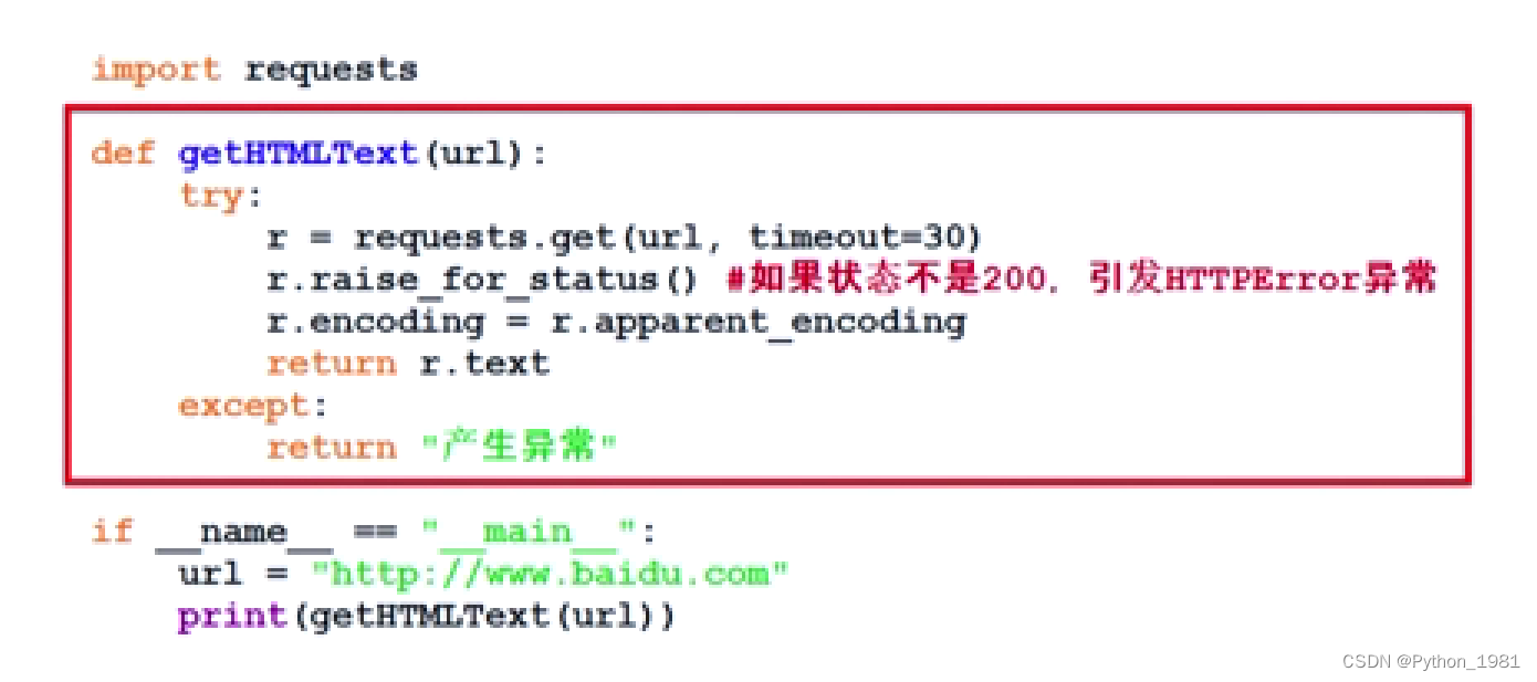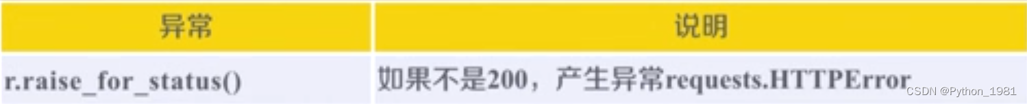 r.raise_for_status(): 判断返回的Response类型的状态是不是200,200表示返回页面的内容是正确的;否则,产生HTTPError 异常