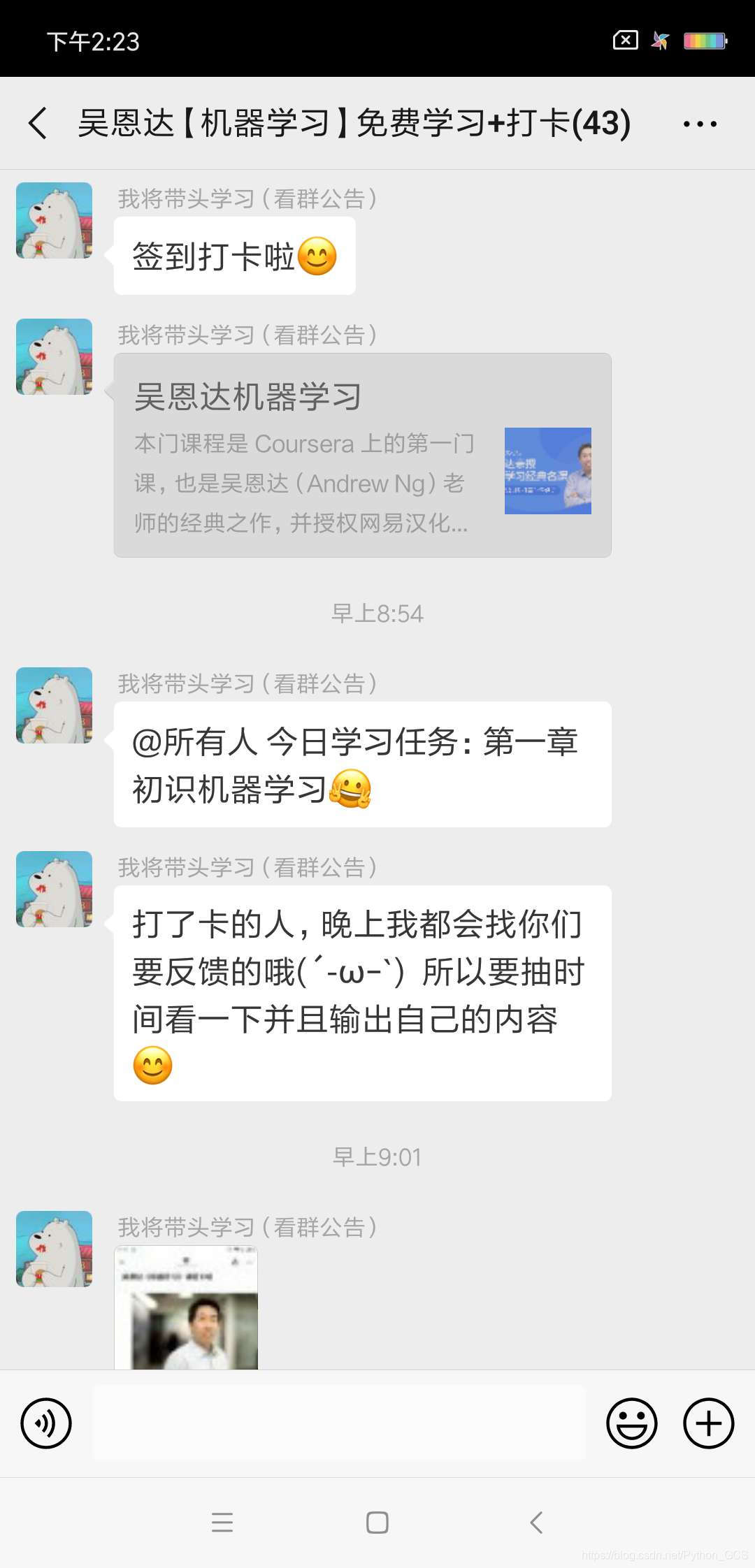 这边为想学习机器学习的同学们 专门建立了一个免费学习+打卡的微信群,群主带头学习,大家都是初学者,不用害怕跟不上进程!只要你能够坚持,我们陪你一起学习。