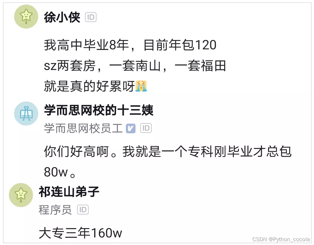 有网友表示楼主举的例子在一线大厂才有,而且百分九十以上是985/211毕业的,普通二本就不要比了,“一线互联网大厂,工作好多年的程序员,也就30w出头”