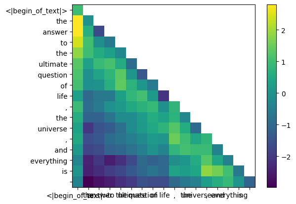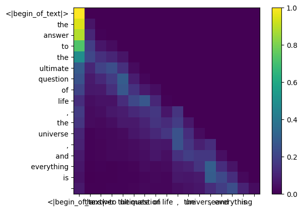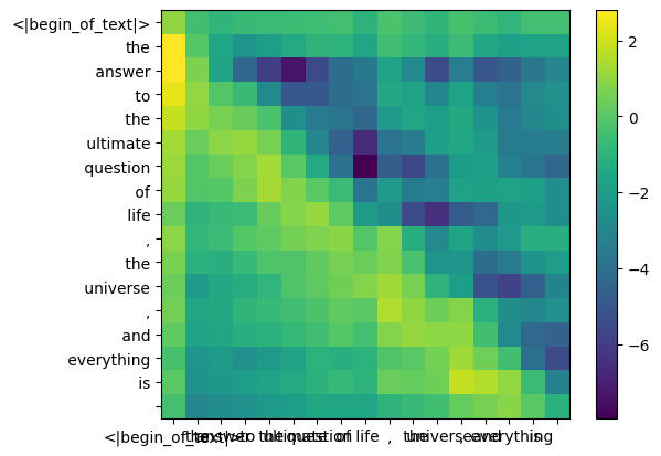 def display_qk_heatmap (qk_per_token):` `_, ax = plt.subplots ()` `im = ax.imshow (qk_per_token.to (float).detach (), cmap='viridis')` `ax.set_xticks (range (len (prompt_split_as_tokens)))` `ax.set_yticks (range (len (prompt_split_as_tokens)))` `ax.set_xticklabels (prompt_split_as_tokens)` `ax.set_yticklabels (prompt_split_as_tokens)` `ax.figure.colorbar (im, ax=ax)` `display_qk_heatmap (qk_per_token)