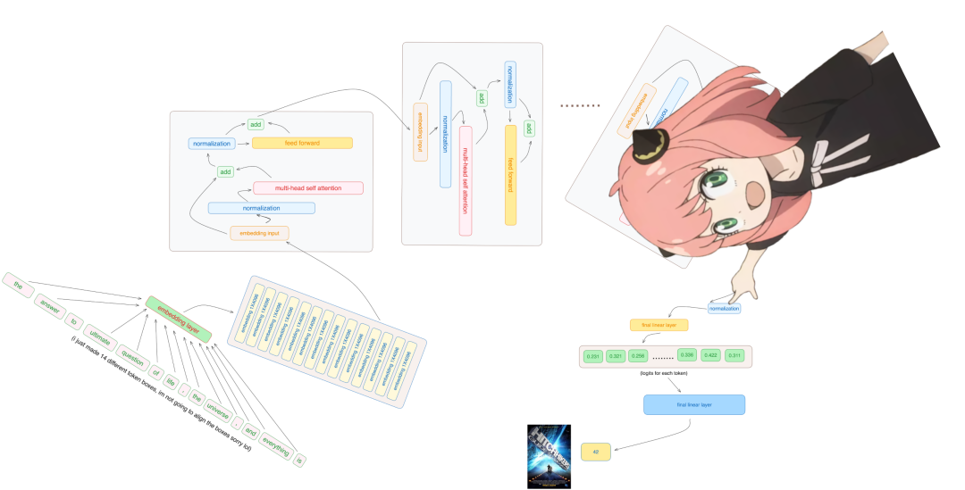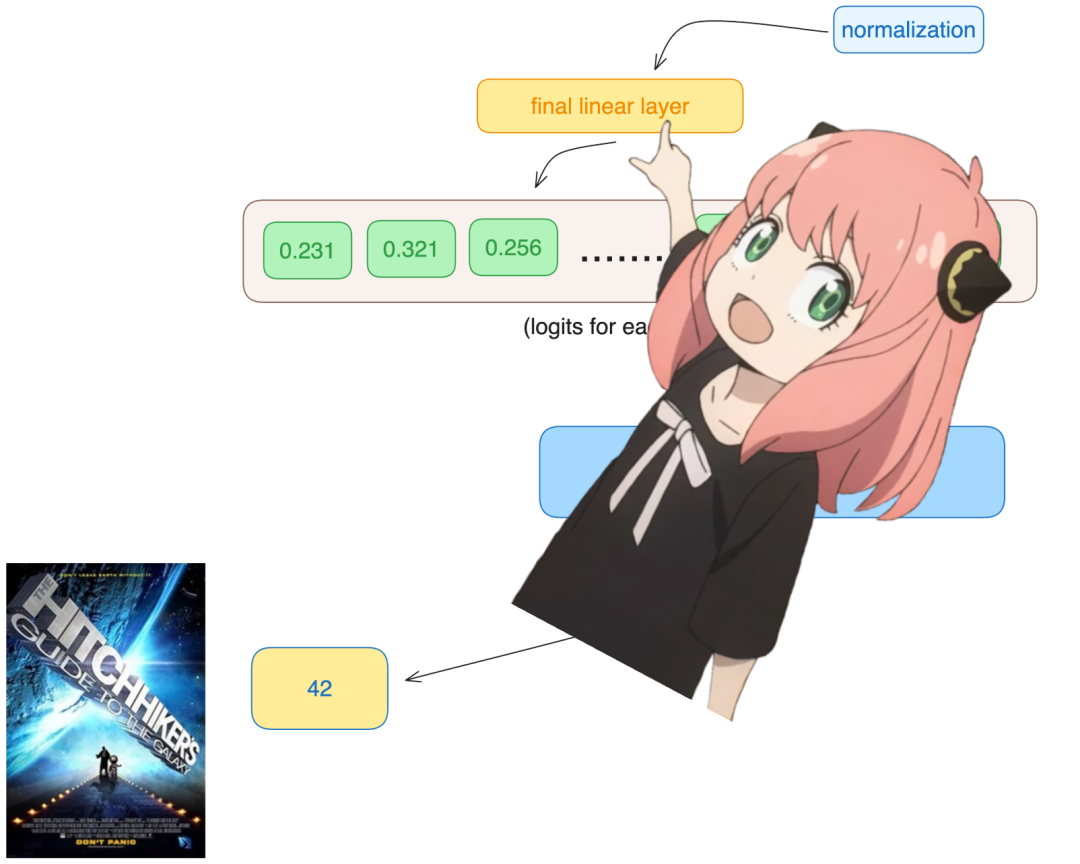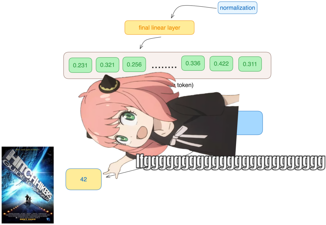 使用最后 token 的嵌入来预测下一个值。在示例中,42 是「生命、宇宙和万物终极问题的答案是什么」的答案,根据《银河系漫游指南》一书,大多数现代 LLMs 都会回答 42,应该验证了整个代码。