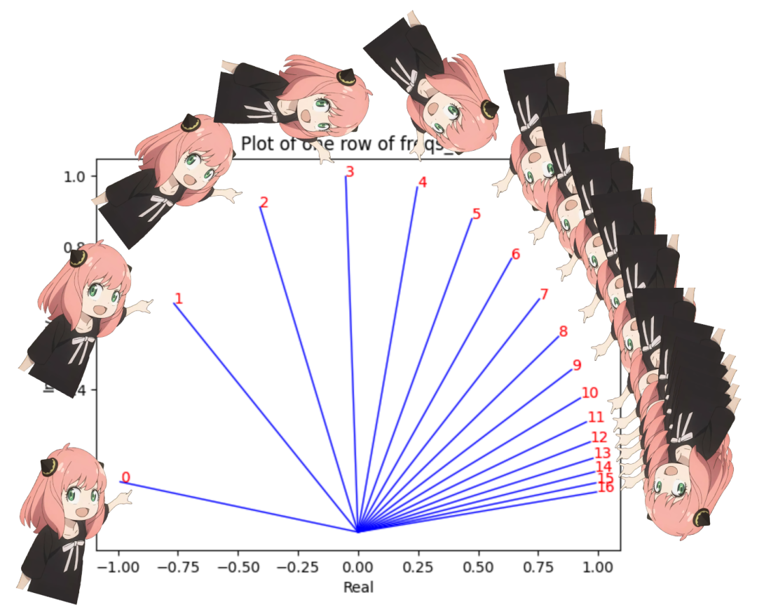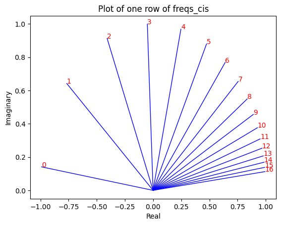 freqs_for_each_token = torch.outer (torch.arange (17), freqs)``freqs_cis = torch.polar (torch.ones_like (freqs_for_each_token), freqs_for_each_token)``freqs_cis.shape``# viewing tjhe third row of freqs_cis``value = freqs_cis [3]``plt.figure ()``for i, element in enumerate (value [:17]):` `plt.plot ([0, element.real], [0, element.imag], color='blue', linewidth=1, label=f"Index: {i}")` `plt.annotate (f"{i}", xy=(element.real, element.imag), color='red')` `plt.xlabel ('Real')` `plt.ylabel ('Imaginary')` `plt.title ('Plot of one row of freqs_cis')` `plt.show ()