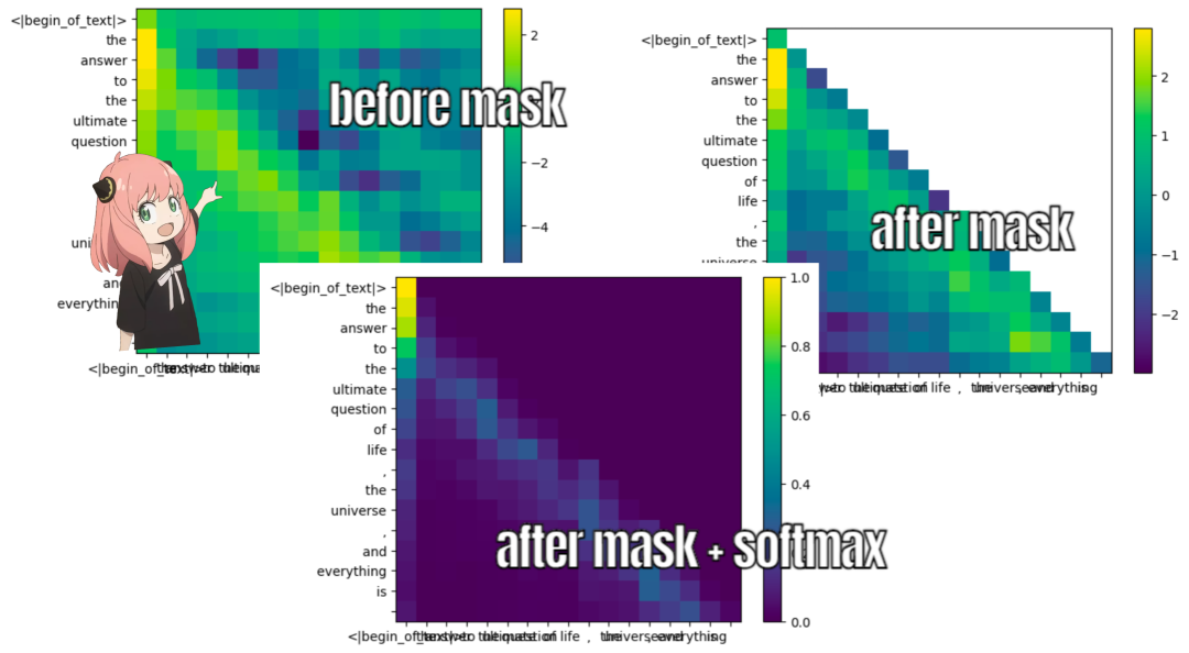 在 llama3 的训练过程中,未来 token 的 qk 分数被掩蔽。这是因为在训练期间,只学习使用过去的 token 来预测未来的 token。因此在推理过程中,将未来的 token 标记为零。