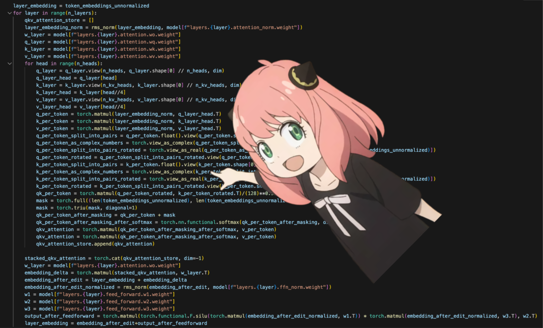 final_embedding = token_embeddings_unnormalized``for layer in range (n_layers):` `qkv_attention_store = []` `layer_embedding_norm = rms_norm (final_embedding, model [f"layers.{layer}.attention_norm.weight"])` `q_layer = model [f"layers.{layer}.attention.wq.weight"]` `q_layer = q_layer.view (n_heads, q_layer.shape [0] //n_heads, dim)` `k_layer = model [f"layers.{layer}.attention.wk.weight"]` `k_layer = k_layer.view (n_kv_heads, k_layer.shape [0] //n_kv_heads, dim)` `v_layer = model [f"layers.{layer}.attention.wv.weight"]` `v_layer = v_layer.view (n_kv_heads, v_layer.shape [0] //n_kv_heads, dim)` `w_layer = model [f"layers.{layer}.attention.wo.weight"]` `for head in range (n_heads):` `q_layer_head = q_layer [head]` `k_layer_head = k_layer [head//4]` `v_layer_head = v_layer [head//4]` `q_per_token = torch.matmul (layer_embedding_norm, q_layer_head.T)` `k_per_token = torch.matmul (layer_embedding_norm, k_layer_head.T)` `v_per_token = torch.matmul (layer_embedding_norm, v_layer_head.T)` `q_per_token_split_into_pairs = q_per_token.float ().view (q_per_token.shape [0], -1, 2)` `q_per_token_as_complex_numbers = torch.view_as_complex (q_per_token_split_into_pairs)` `q_per_token_split_into_pairs_rotated = torch.view_as_real (q_per_token_as_complex_numbers * freqs_cis)` `q_per_token_rotated = q_per_token_split_into_pairs_rotated.view (q_per_token.shape)` `k_per_token_split_into_pairs = k_per_token.float ().view (k_per_token.shape [0], -1, 2)` `k_per_token_as_complex_numbers = torch.view_as_complex (k_per_token_split_into_pairs)` `k_per_token_split_into_pairs_rotated = torch.view_as_real (k_per_token_as_complex_numbers * freqs_cis)` `k_per_token_rotated = k_per_token_split_into_pairs_rotated.view (k_per_token.shape)` `qk_per_token = torch.matmul (q_per_token_rotated, k_per_token_rotated.T)/(128)**0.5` `mask = torch.full ((len (token_embeddings_unnormalized), len (token_embeddings_unnormalized)), float ("-inf"))` `mask = torch.triu (mask, diagonal=1)` `qk_per_token_after_masking = qk_per_token + mask` `qk_per_token_after_masking_after_softmax = torch.nn.functional.softmax (qk_per_token_after_masking, dim=1).to (torch.bfloat16)` `qkv_attention = torch.matmul (qk_per_token_after_masking_after_softmax, v_per_token)` `qkv_attention_store.append (qkv_attention)`` `` ` `stacked_qkv_attention = torch.cat (qkv_attention_store, dim=-1)` `w_layer = model [f"layers.{layer}.attention.wo.weight"]` `embedding_delta = torch.matmul (stacked_qkv_attention, w_layer.T)` `embedding_after_edit = final_embedding + embedding_delta` `embedding_after_edit_normalized = rms_norm (embedding_after_edit, model [f"layers.{layer}.ffn_norm.weight"])` `w1 = model [f"layers.{layer}.feed_forward.w1.weight"]` `w2 = model [f"layers.{layer}.feed_forward.w2.weight"]` `w3 = model [f"layers.{layer}.feed_forward.w3.weight"]` `output_after_feedforward = torch.matmul (torch.functional.F.silu (torch.matmul (embedding_after_edit_normalized, w1.T)) * torch.matmul (embedding_after_edit_normalized, w3.T), w2.T)` `final_embedding = embedding_after_edit+output_after_feedforward