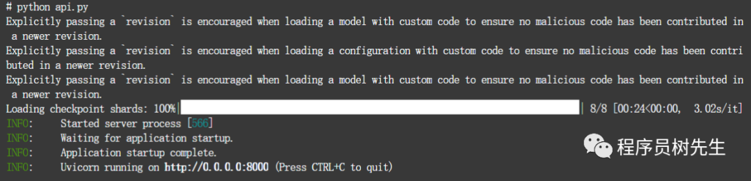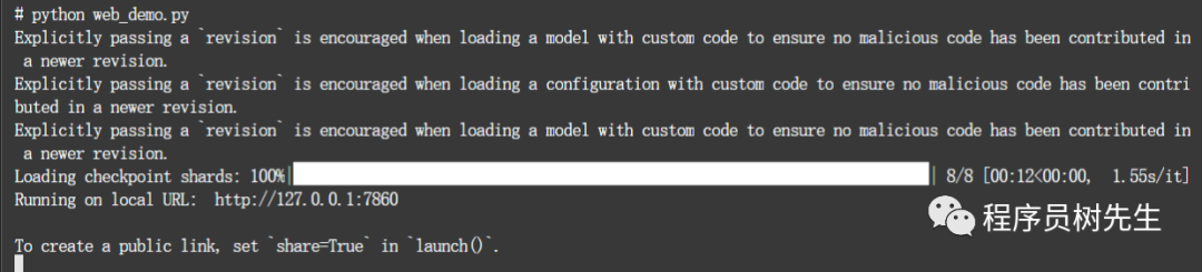 # 因为前面改了模型默认下载地址,所以这里需要改下路径参数 # 分别修改 web_demo.py、cli_demo.py、api.py 文件 tokenizer = AutoTokenizer.from_pretrained("/mnt/workspace/chatglm-6b", trust_remote_code=True) model = AutoModel.from_pretrained("/mnt/workspace/chatglm-6b", trust_remote_code=True).half().cuda() # 如果想要暴露在公网上,需要修改 web_demo.py 文件 demo.queue().launch(share=True, inbrowser=True, server_name='0.0.0.0', server_port=7860)