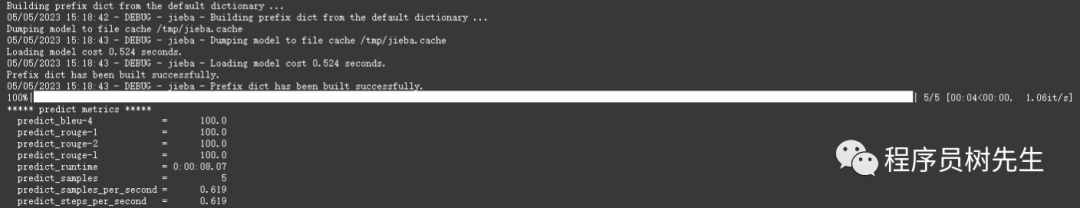 执行完成后,会生成评测文件,评测指标为中文 Rouge score 和 BLEU-4。生成的结果保存在 ./output/adgen-chatglm-6b-pt-32-2e-2/generated_predictions.txt。我们准备了 5 条推理数据,所以相应的在文件中会有 5 条评测数据,labels 是 dev.json 中的预测输出,predict 是 ChatGLM-6B 生成的结果,对比预测输出和生成结果,评测模型训练的好坏。如果不满意调整训练的参数再次进行训练。