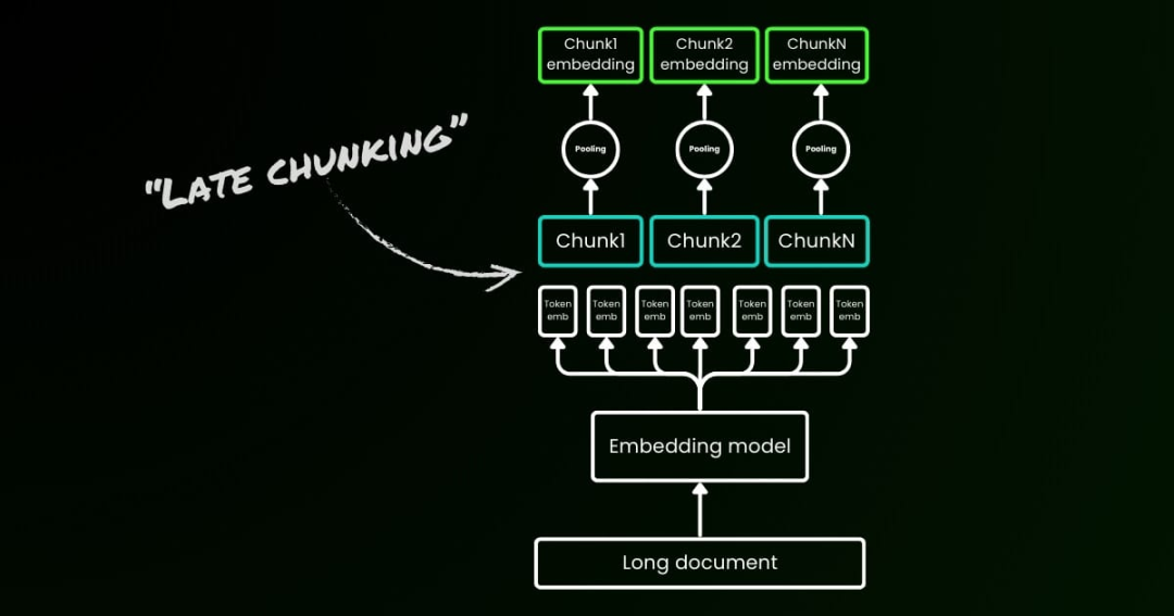 在传统的文本编码领域,我们常常采用一种“预先分块”的策略,即先分块,再过 Embedding 模型。首先依据句子、段落或预设的最大长度对文本进行切割。随后,Embedding 模型会对这些切割好的文本块逐一进行处理,通过平均池化等方法,将 token 级的 Embedding 聚合成单一的块 Embedding 向量。如下图左侧所示: