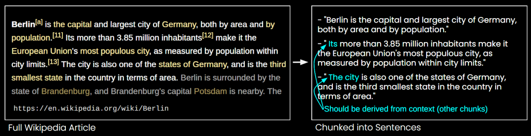 以维基百科上的一篇关于柏林的文章为例,若将其分割为句子块,不难发现诸如“其”和“这座城市”等指代表达,实际上指向的是文章开头提到的“柏林”。这种情况下,Embedding 模型很难将这些指代正确链接到实体,进而产生质量低下的向量表示。