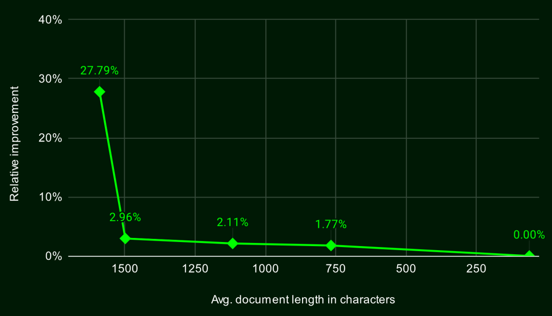 若将传统分块与迟分的性能差距与文档长度进行关联分析,我们会发现一个有趣的现象:文档越长,迟分策略带来的 nDCG 得分提升越明显。换句话说,文档越长,迟分策略的效果就越显著。