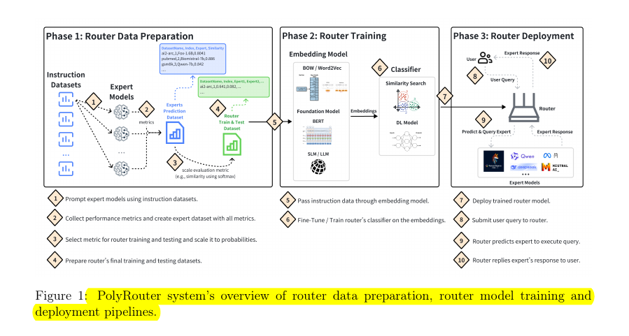 部署使用:新来一个查询,系统先编码成向量,预测最适合的专家模型,然后把任务转发给这个模型处理。