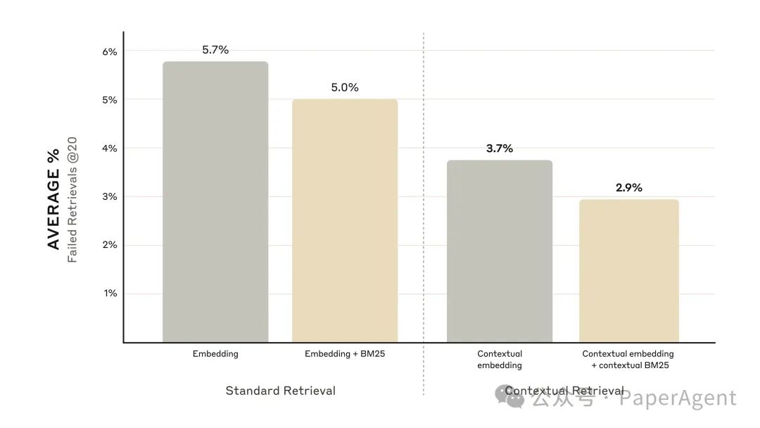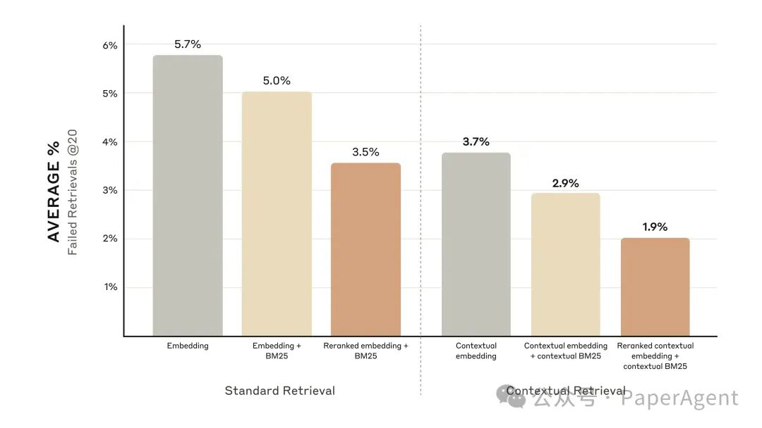 结合上下文嵌入和上下文BM25将Top20个块的检索失败率降低了49%(5.7% → 2.9%)。