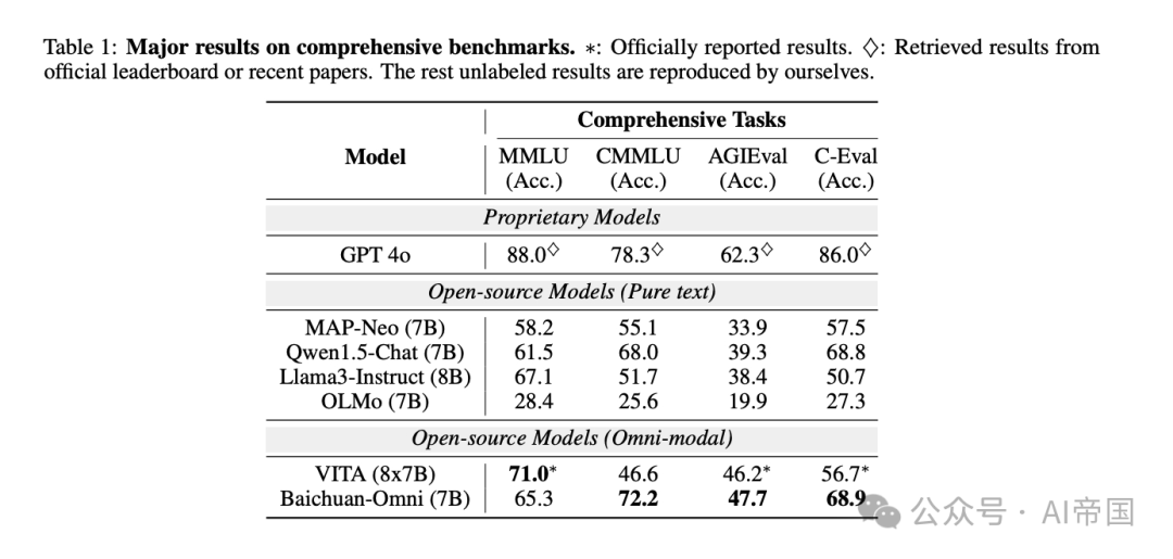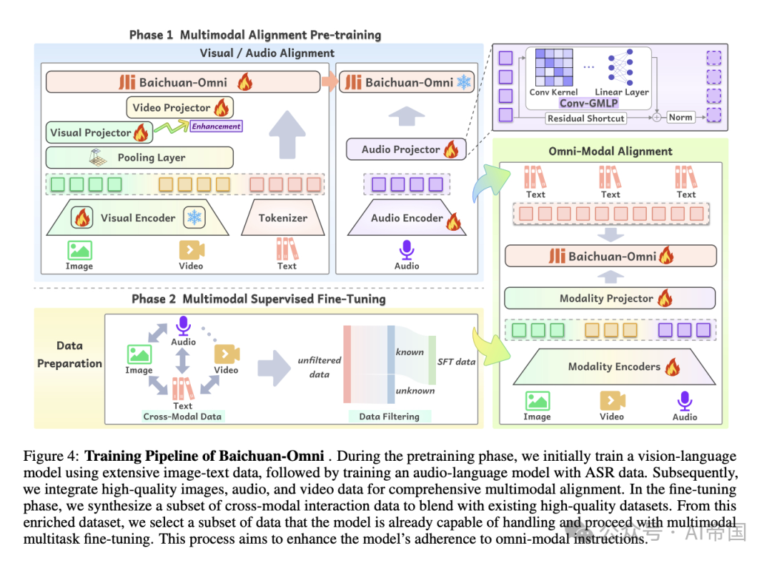 Baichuan-Omni是如何实现这一壮举的呢?研究团队采用了一种创新的多模态训练方案,从7B参数的基础模型出发,通过多模态对齐和多任务微调两个阶段,赋予了语言模型处理视觉和音频数据的能力。这种方法使Baichuan-Omni能够在各种全模态和多模态基准测试中展现出强劲的性能。