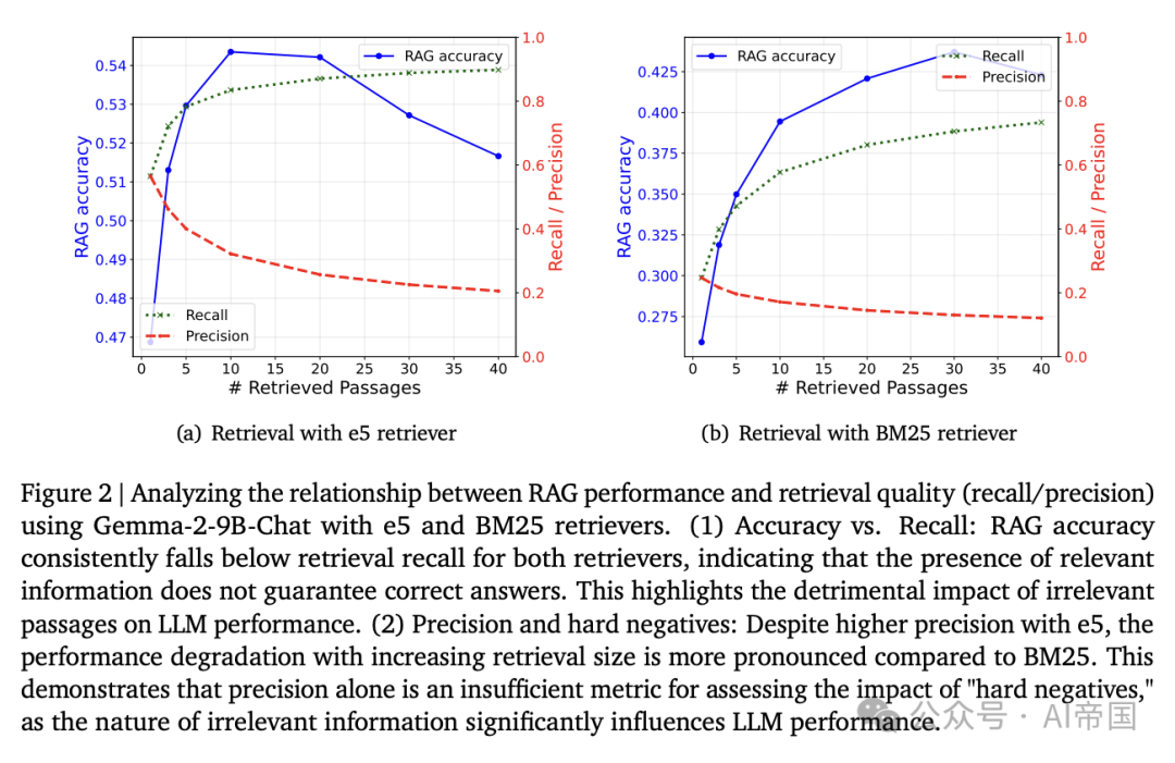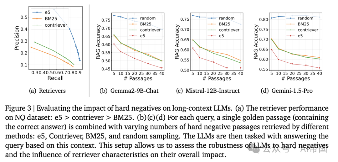 研究团队发现,随着检索段落数量的增加,LLM的生成质量先是提升,但随后却开始下滑。这种"适得其反"的现象主要源于所谓的"硬负例"——那些看似相关但实际上会误导LLM的信息。更糟糕的是,使用更强大的检索器反而会加剧这个问题,这完全颠覆了我们对RAG技术的认知。