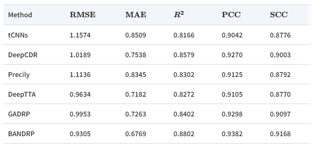 作者将BANDRP与一些具有代表性的方法进行了比较,如表1所示。为了评估BANDRP的性能,作者采用了均方根误差(RMSE),平均绝对误差(MAE),决定系数(R2), Pearson相关系数(PCC)和Spearman相关系数(SCC)。RMSE和MAE越低越好,R2, PCC和SCC越高越好。结果表明,BANDRP性能超过了现有模型。