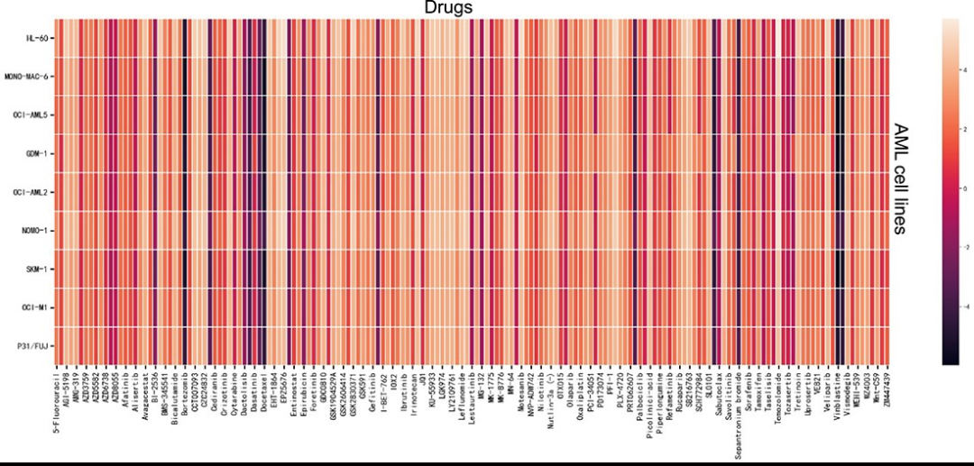 作者还进行了案例分析。急性髓系白血病(Acute myeloid leukemia,AML)是一种较为棘手的血液系统癌症,其特点是骨髓中血细胞的异常增殖。在本研究中,作者使用基准数据集对AML细胞系进行了从头测试。更具体地说,选择9个AML细胞系,并指定与这些细胞系相关的药物反应作为测试集。剩余的药物反应用于模型训练。结果包括预测9种AML细胞系中169种药物的IC50值(见图2)。根据平均值对AML细胞系中预测的药物值进行排序后,显示敏感性最高的3种药物是长春花碱(Vinblastine)、多西他赛(Docetaxel)和硼替佐米(Bortezomib)。值得注意的是,现有的生物学实验证实了这些药物在AML治疗中的有效性。这些结果表明,BANDRP可以帮助发现抗癌药物的新治疗效果,并为癌症治疗提供潜在的治疗选择。