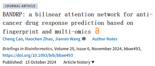 2024年10月15日,中南大学王建新教授团队在Briefings in Bioinformatics上发表文章BANDRP: a bilinear attention network for anti-cancer drug response prediction based on fingerprint and multi-omics。
