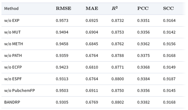 作者设计了消融实验来验证模型设计的有效性。如表2所示,作者分别去除细胞系的基因表达特征(EXP),基因突变特征(MUT),甲基化特征(METH),通路特征(PATH),以及药物的三种指纹(ECFP, ESPF, PubChemFP),评估其对模型的影响。BANDRP的性能优于去除某一种特征的模型,表明这些特征都对BANDRP的性能提升做出了贡献。