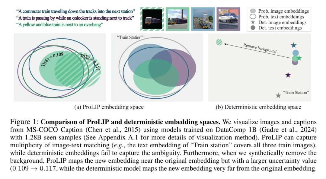 相反,一个描述可能对应多个描述相似场景或目标的图像,例如“一列火车”可以与所有火车图像匹配。然而,如图1(b)所示,确定性模型(例如CLIP(Radford等人,2021年))无法捕捉这种多发性,例如“火车站”的嵌入位置与其它火车图像和描述无关。这是因为CLIP损失迫使正样本对靠近且随机负样本远离,当作者将其映射到欧几里得空间中的一个点时,没有稳定解。