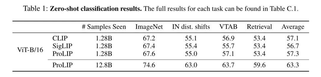 第三,ProLIP可以从零开始训练,无需任何预训练模型,并实现最先进的零样本学习能力,无需微调。此外,ProLIP实现了强大的零样本能力,例如,使用ViT-B/16 Backbone 网络实现了74.6%的ImageNet零样本准确性,而具有相同数量的可见样本的CLIP模型仅实现了73.5%(Ilharco等人,2021)。