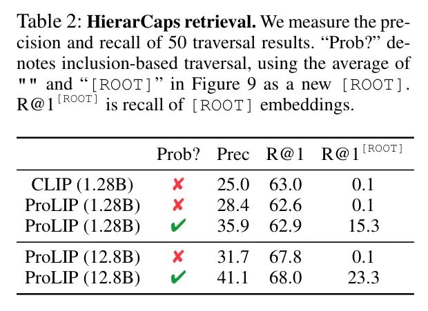 图像遍历。作者遵循Desai等人(2023年)的协议。首先设置[ROOT]嵌入。然后,获取给定图像的最接近的描述,并用50个等间距步骤插值[ROOT]和文本嵌入。Desai等人(2023年)使用空文本嵌入作为CLIP嵌入空间的[ROOT]。在ProLIP的情况下,作者可以利用额外的不确定性信息和包含假设。因此,作者通过搜索包含给定图像嵌入的文本嵌入来搜索给定嵌入的根嵌入。其他程序等于Desai等人(2023年)。作者在HierarchCaps上执行遍历。