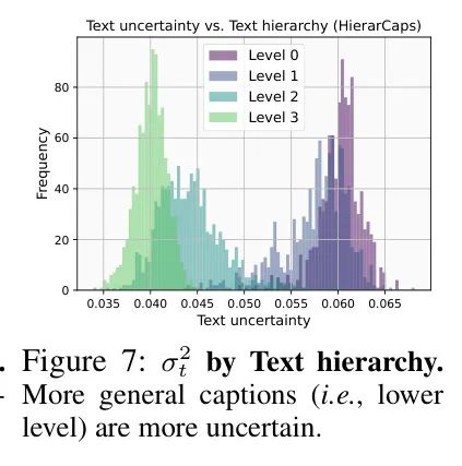 从这个观察中,作者探索了不确定性与不同描述 Level 之间的关系。作者使用了HierarCaps数据集,其图像具有从COCO Caption及其逻辑推论层次结构中包含的四种不同 Level 的描述(例如,“鸟”“蓝色鸟”…)。如图9所示。图7显示了文本不确定性与文本层次之间的关系。在这里,0表示最通用的描述,例如“椅子”或“鸟”,而4代表100OCO Caption的原始描述。如图所示,更通用的描述(较低的 Level )往往具有更大的不确定性,而更具体的描述(较高的 Level )往往具有较小的不确定性。