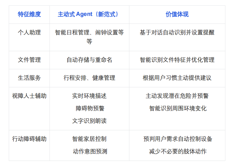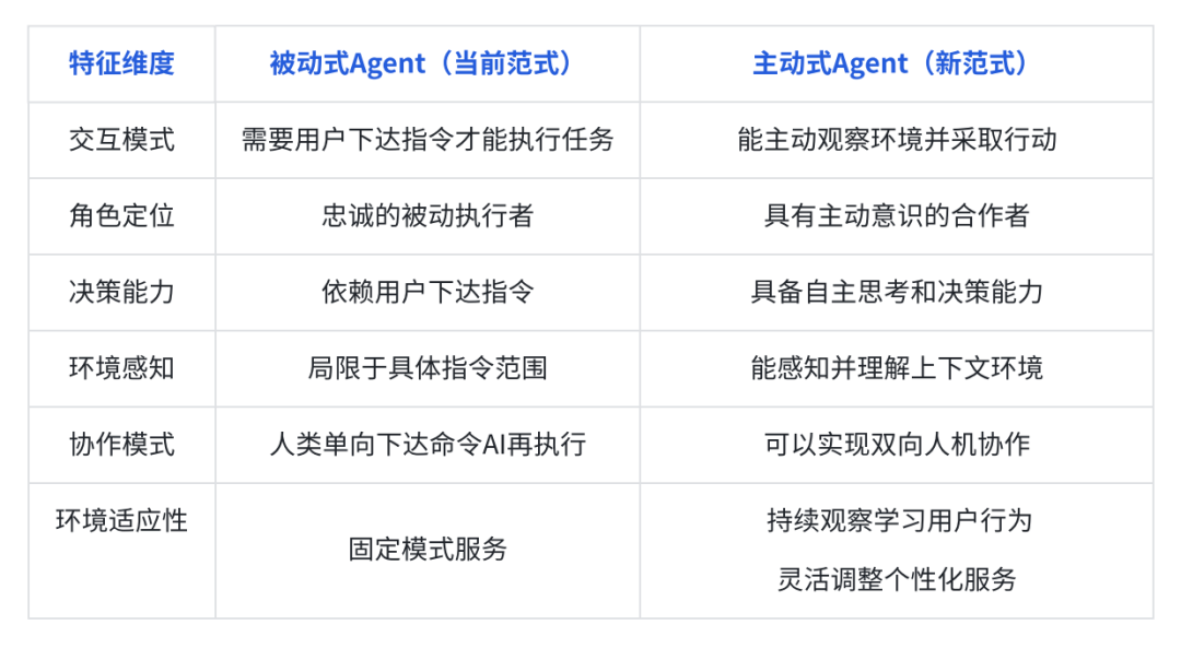 这一新范式下的 Agent 不再是简单的指令执行者,而是升级成为了具有"眼力见"的智能助手。它具备"眼中有活、主动帮助"的主观能动性,能够主动观察环境、预判用户需求,像"肚子里的蛔虫"一样,在未被明确指示的情况下主动帮用户排忧解难,主动 Agent 实现了从"被命令"到"会思考"的质的飞跃。