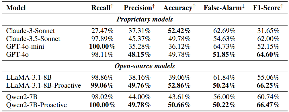 通过给予模型来自奖励模型的反馈,所有的模型误报率都有所下降,准确度有所上升,但在召回率的表现上有明显下降。通过结合奖励模型,主动智能体可以更好的检测用户需求,降低误报率。