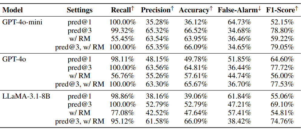 对于开源模型,经过数据集训练的模型明显更优,这证实了研究数据合成流水线的有效性。同时,经过训练的模型也在误报率上有了明显的下降,尽管提供不必要的帮助的情况仍然存在。