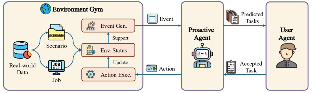 如果主动智能体没有检测到需要,其将保持静默,反之将会提出一个任务。一旦此任务被用户接受,那么主动智能体将在环境模拟器中执行该任务,并进而产生后续的系列事件。