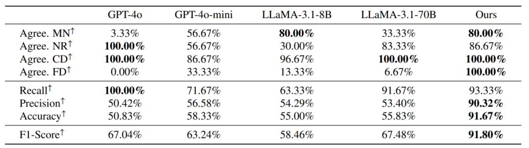▲ 图表3. 不同模型作为奖励模型的评测结果。研究展示了模型与人工标注员多数投票结果之间的一致性。在 LLaMA-3.1-instruct-8B 微调的模型取得了最好结果。