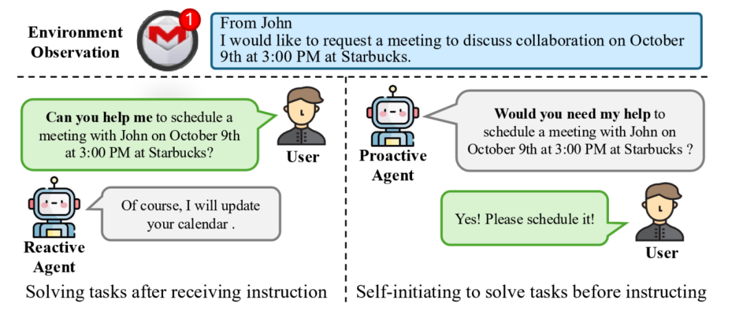 ▲ 图1. 两种人类与智能体交互形式的比对。左侧的被动式 Agent 只能被动接受用户指令并生成回复,而右侧的主动式 Agent 可以通过观测环境主动推断与提出任务。