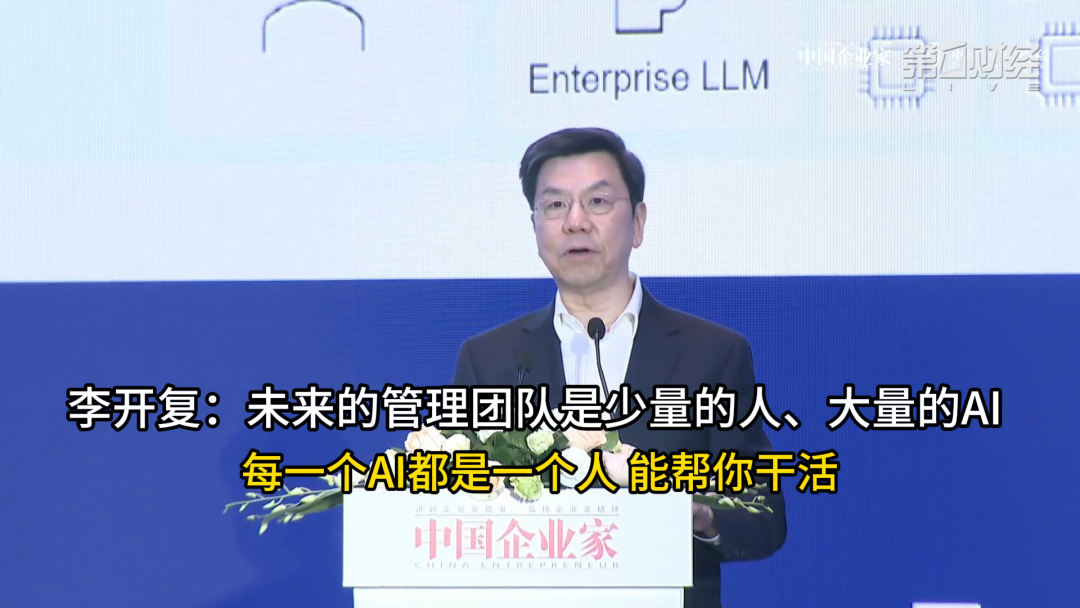 李开复还提到,AI时代将重写所有应用,超越移动互联网,并强调了AI在企业管理模式中的重要作用。