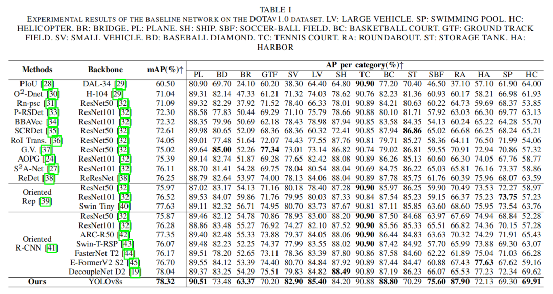 在航空影像中实现旋转边界框目标检测的计算效率与检测精度之间的平衡是一个重大挑战。尽管先前的研究致力于创建轻量级模型以提升计算性能和特征提取能力,但在遥感(RS)影像中检测小目标和多尺度目标时,这些网络的性能仍存在差距。为了应对这些挑战,作者提出了一种针对YOLOv8模型的创新增强,专门用于定向目标检测任务,并优化了计算资源有限的环境。该模型采用了基于小波变换的C2f模块来捕捉关联特征,并引入了自适应尺度特征金字塔(ASFP)模块,利用P2层细节信息。此外,GhostDynamicConv的引入显著增强了模型的轻量化特性,确保了航空影像分析的高效性。该方法的参数量为21.6M,相比具有23.3M参数的DecoupleNet,提供了更高效的架构设计,同时在DOTAv1.0数据集上展示了与DecoupleNet等领先方法相媲美的平均精度(mAP)。该模型的效率及其减少的参数量使其成为航空目标检测的强有力候选,特别是在资源受限的环境中。