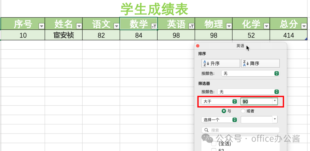 2、接着采用同样的方法,设置第二个条件,即英语成绩大于90。