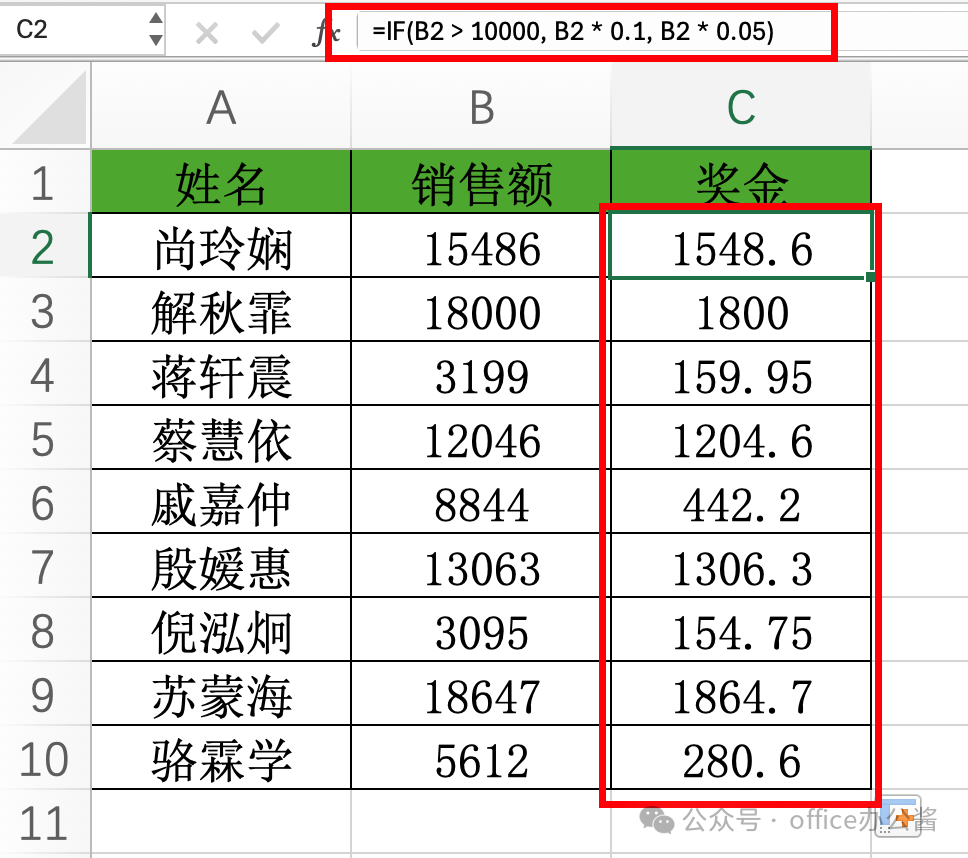 替换之后的公式为 =IF(B2 > 10000, B2 * 0.1, B2 * 0.05)