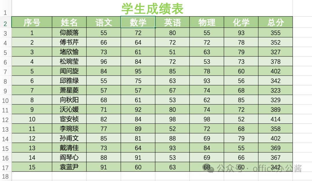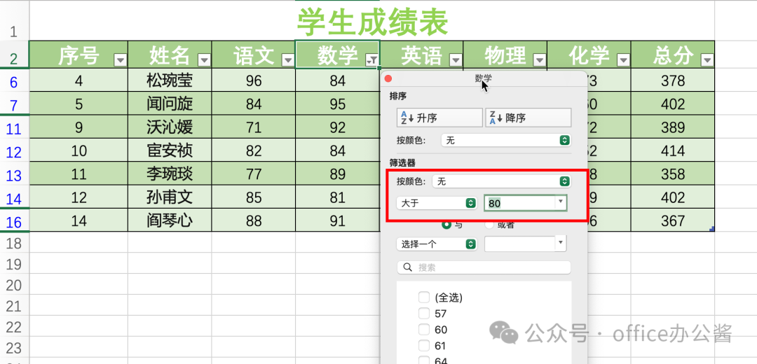 1、首先将表格转换为动态表(也叫做超级表),此时每列标题单元格都会添加上一个筛选按钮,我们先点击数学成绩列,将筛选条件设置为大于80。