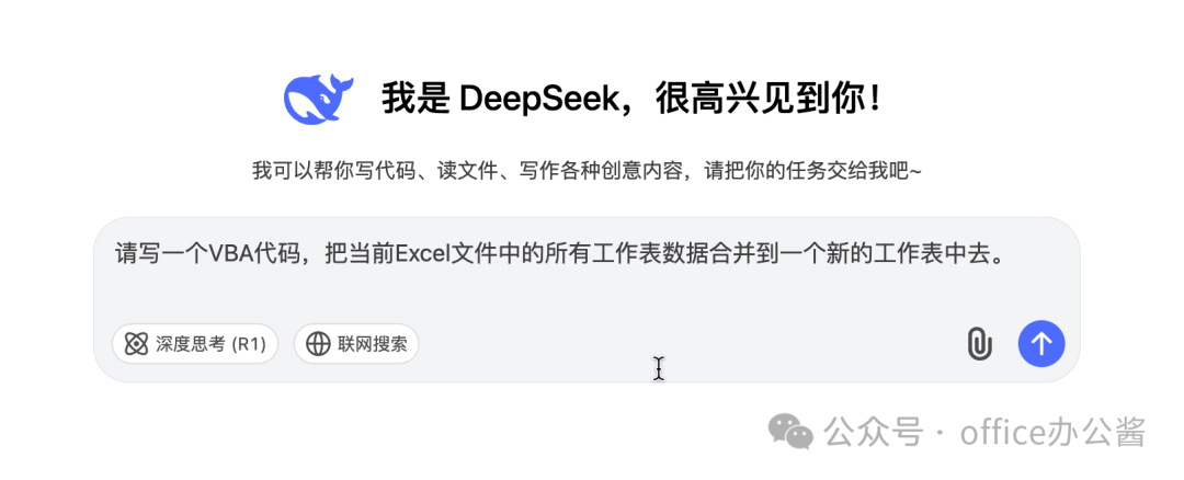 1、打开DeepSeek,在对话框中输入指令: 请写一个VBA代码,把当前Excel文件中的所有工作表数据合并到一个新的工作表中去。