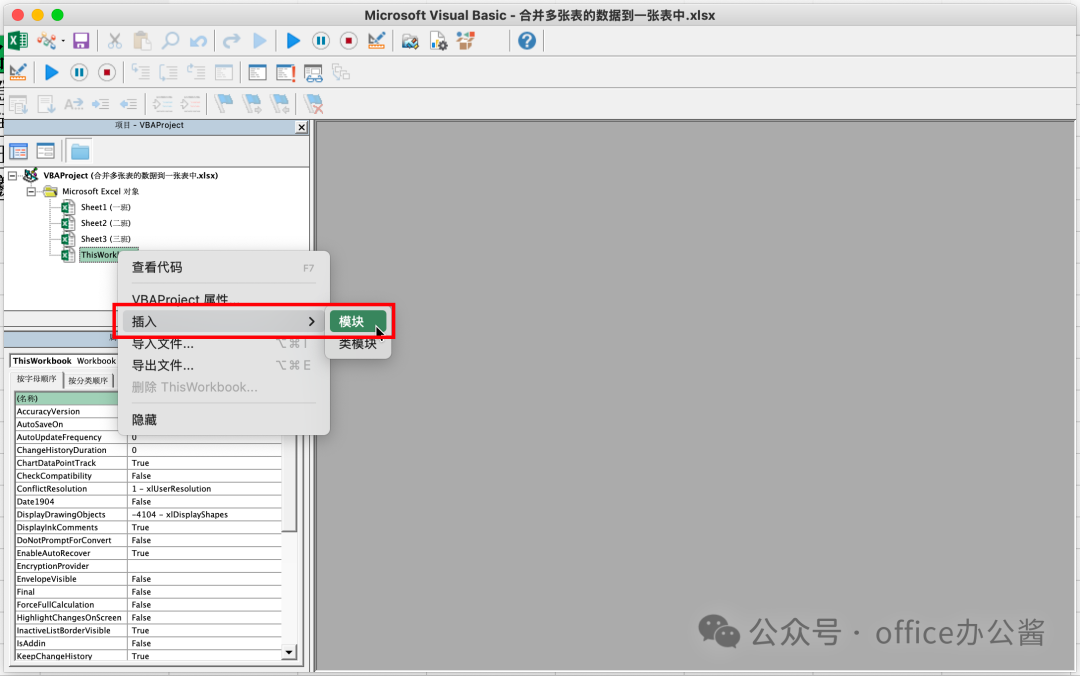 3、复制生成好的VBA代码,回到Excel文件中,按下快捷键Alt+F11打开代码编辑器,然后选中当前工作簿,右键插入一个新的模块。