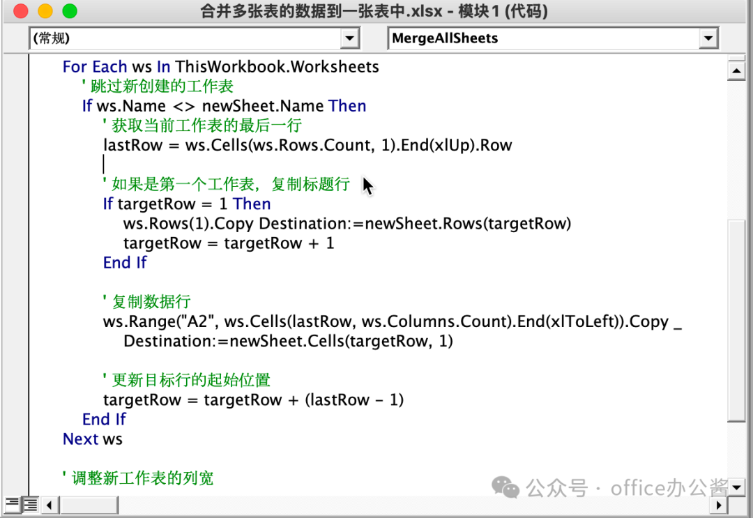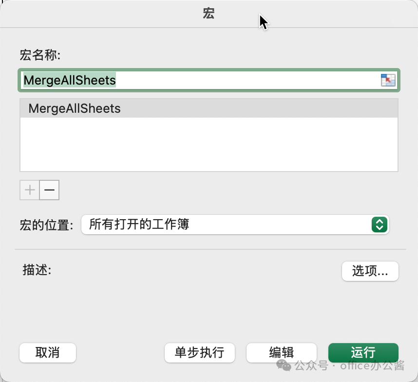 5、按下快捷键Alt+F8,选择MergeAllSheets宏并运行。
