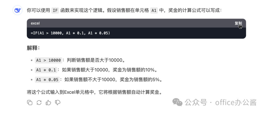2、复制DeepSeek生成好的公式,将其粘贴到要计算奖金的单元格中,不过由于它假设销售额数据在A1单元格,而实际当前案例中销售额是处于B2单元格中,所以我们要将A1替换为B2。