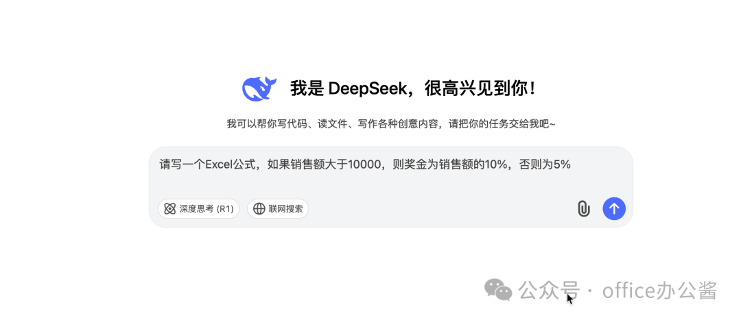 1、打开DeepSeek官网,在对话框中输入需求,本例中可以这样输入: **请写一个Excel公式,如果销售额大于10000,则奖金为销售额的10%,否则为5%**。