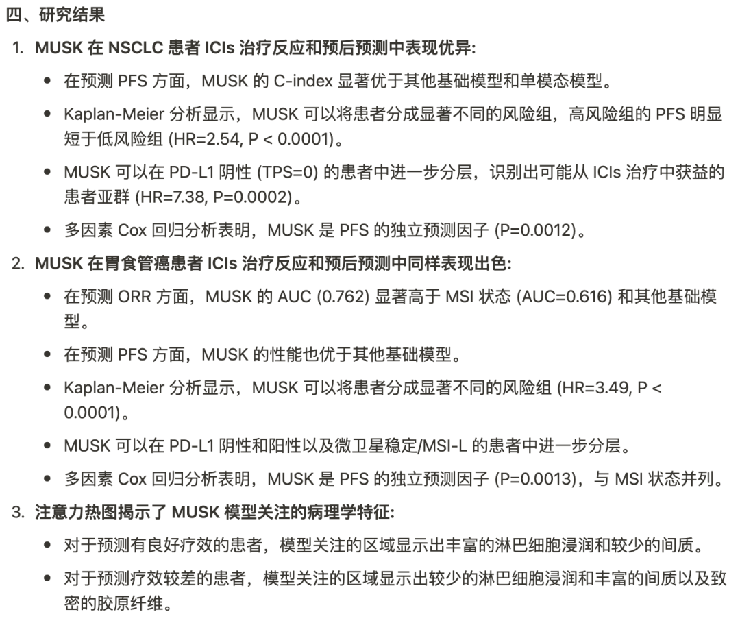 七、MUSK 模型在预测免疫检查点抑制剂 (ICIs) 治疗反应方面的应用和性能